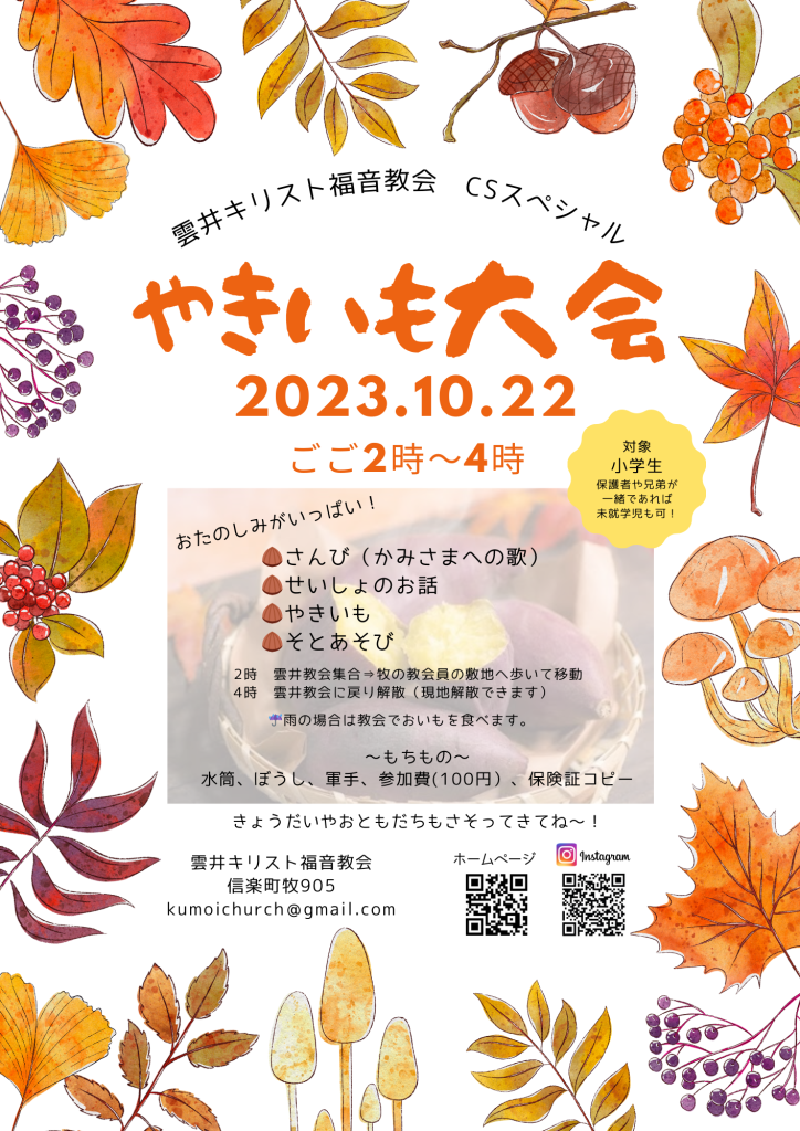 10月22日(日)午後2時~「やきいも大会」 投稿者: 山崎紫音 投稿日: 2023年10月16日 10月22日のCSスペシャルは、、、 「やきいも大会」!! 牧師先生の畑で採れたおいもをいただきます(*^^*) 遊んで、おいもを食べて、楽しいひと時をぜひ! 初めてのお友だちも大歓迎です(^^)/ 兄弟や保護者が一緒であれば、未就学児もぜひお越しください♫ 共有: クリックして X で共有 (新しいウィンドウで開きます) X Facebook で共有するにはクリックしてください (新しいウィンドウで開きます) Facebook いいね 読み込み中…