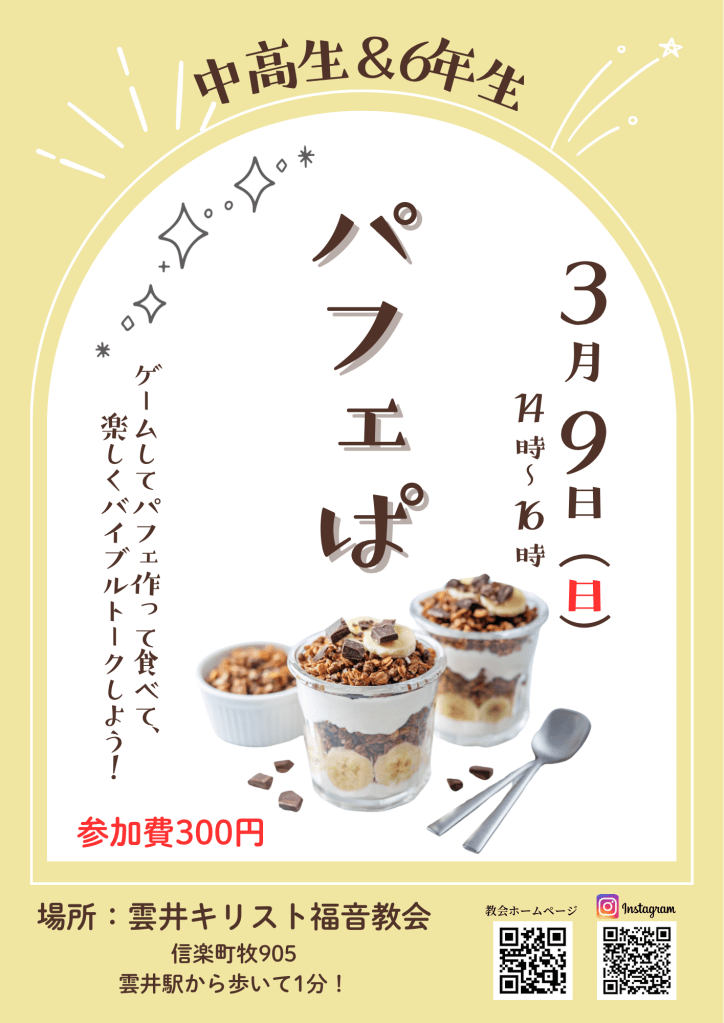3月9日は中高生クラス🍨 投稿者: 山崎紫音 投稿日: 2025年3月5日 ぜひお知り合いにもお声かけくださいね 3月9日は、中高生クラスをします👏 今回は、6年生も参加できます! パフェ作って食べながら、ゆるっと、おしゃべりしよう〜^^ 教会初めての方も大歓迎です! 中高生クラスは、毎月第2日曜日 14時〜16時 に開催します😊 お待ちしています✨ 共有: クリックして X で共有 (新しいウィンドウで開きます) X Facebook で共有するにはクリックしてください (新しいウィンドウで開きます) Facebook いいね 読み込み中…