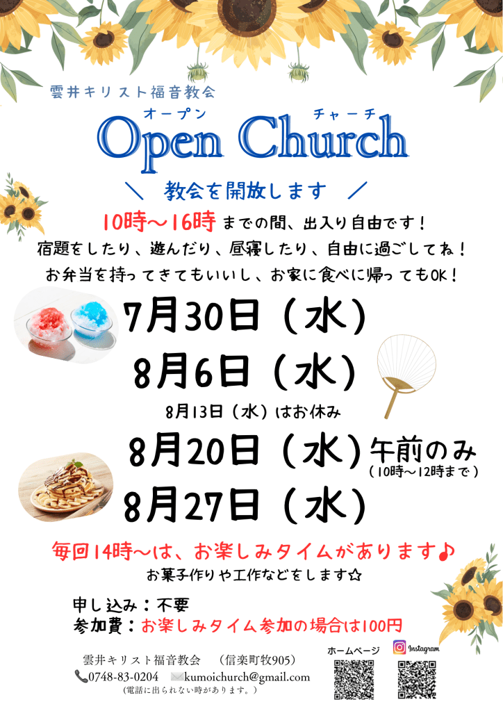 子どもたちの夏休みの間、週一回ではありますが、教会を開放します⛪️