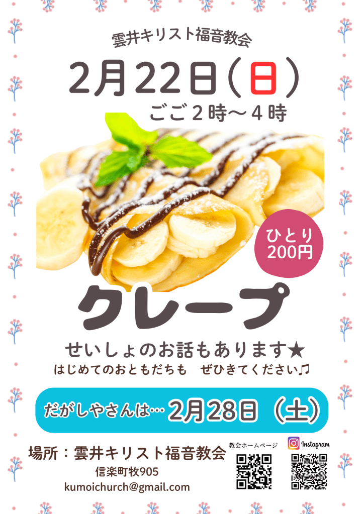 2月22日!クレープします✨ 投稿者: kumoichurch 投稿日: 2026年2月16日 2月22日はのキングダムキッズ(CSスペシャル)は… クレープです✨✨ 一人200円をお持ちください^^ また今月の駄菓子屋は、2月28日(土)午後1時〜5時です!こちらもぜひお越しください🍬 未就学児さんや、保護者の方のご参加も大歓迎です🤗教会初めて…気になるな…という方も、ぜひお気軽にお越しくださいね😌 お待ちしております💕 共有: X で共有 (新しいウィンドウで開きます) X Facebook で共有 (新しいウィンドウで開きます) Facebook いいね 読み込み中…